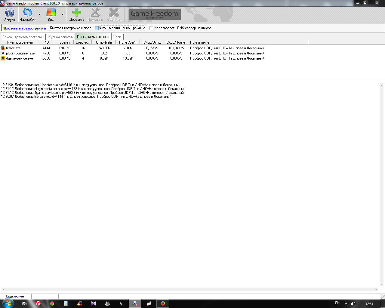 "Примечание: При правильной настройке клиента, на вкладке "Программы в шлюзе" клиента Game Freedom Вы должны увидеть браузер,