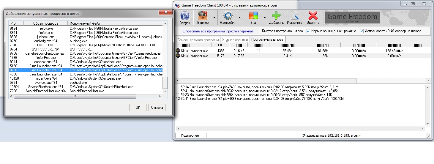 Да, работает, если принудительно запихнуть в шлюз все клоны лаунчера. Странно, что программа сама не определяет запущенные лаунчеры (программы) в режиме перехвата всех запущенных программ. Всё что нужно и не нужно он перехватывает, кроме сирус лаунчера...